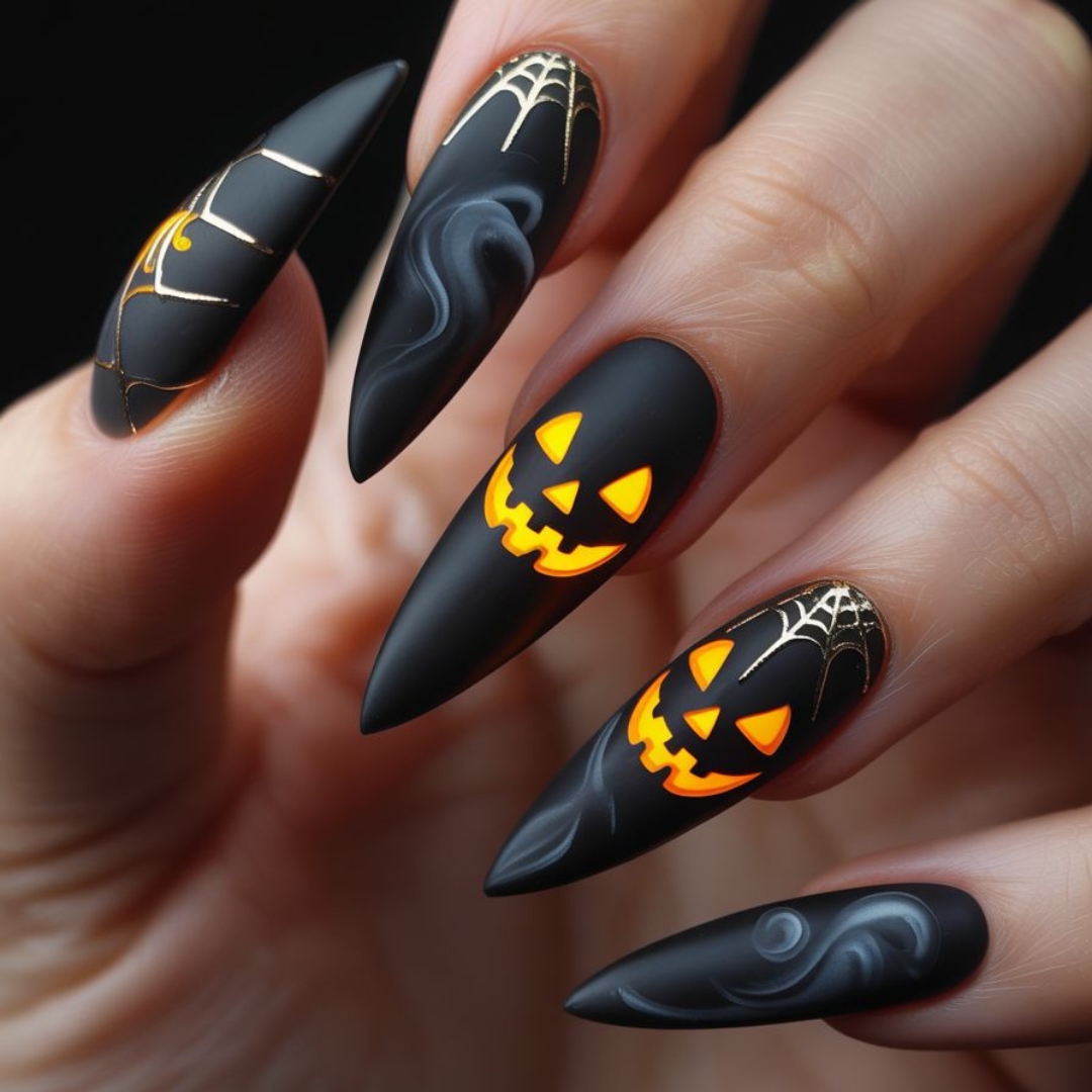 - Calabazas naranjas: pintá la uña de naranja y agregá caritas con esmalte negro.