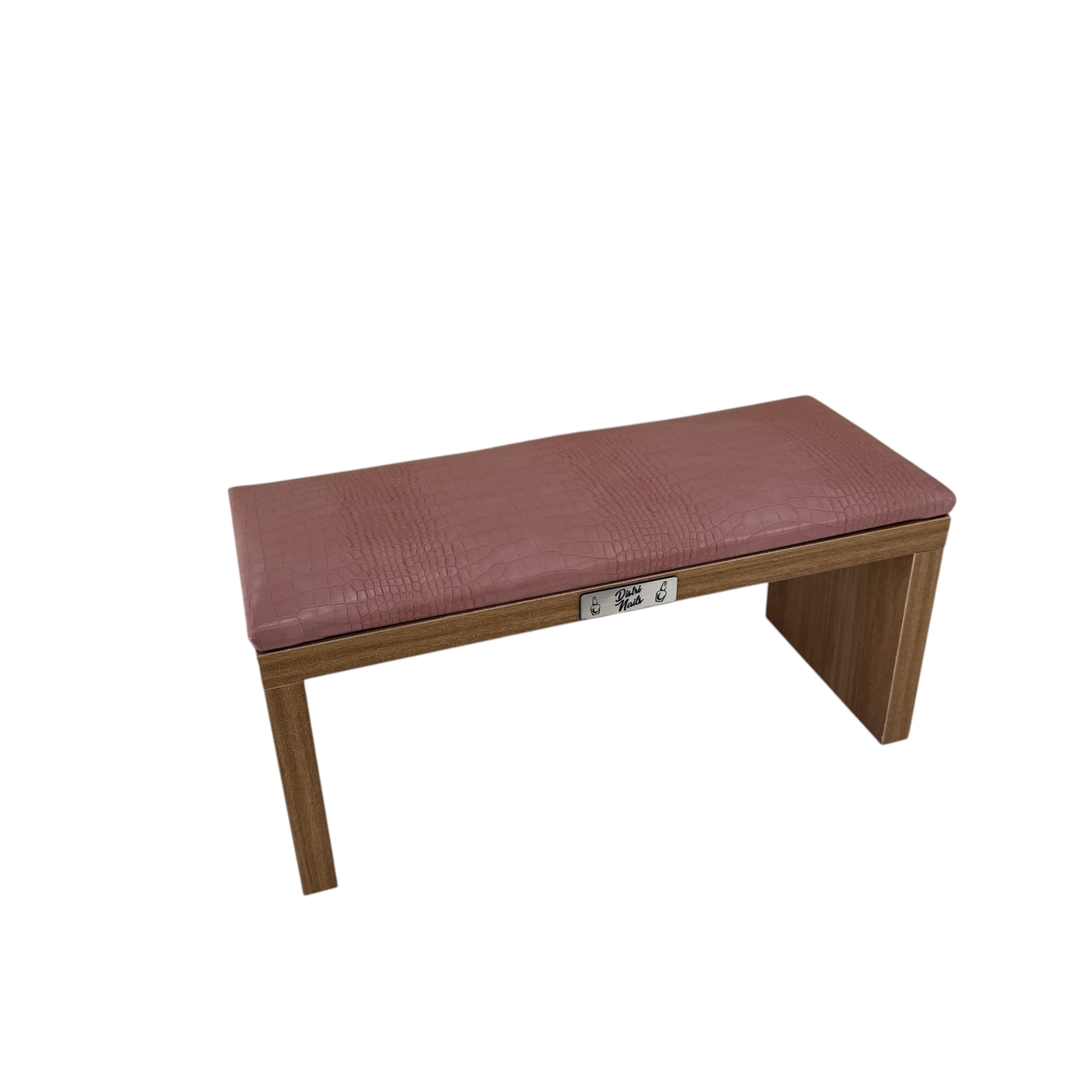 Apoya manos en color de madera scotch con tapizado croco rosa.