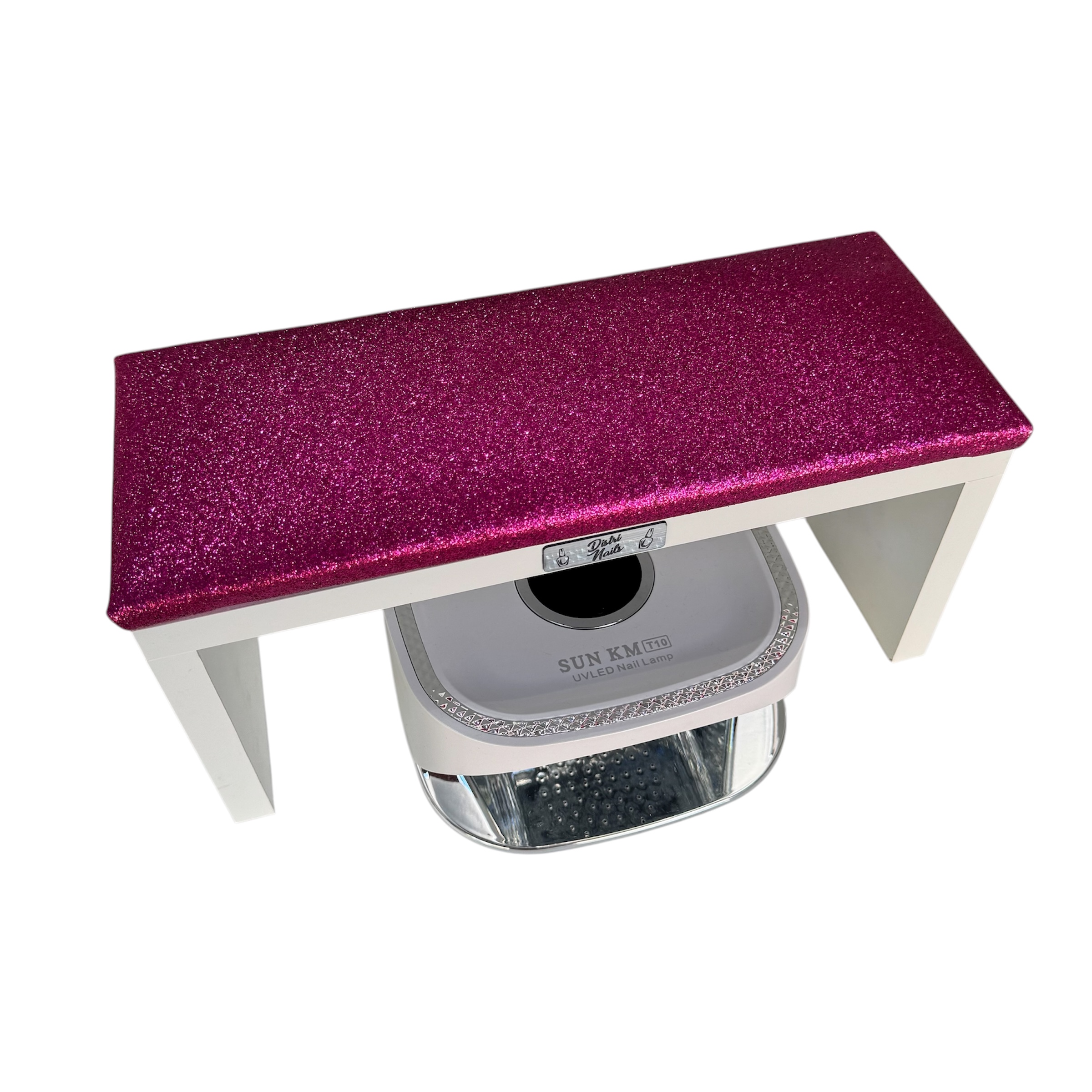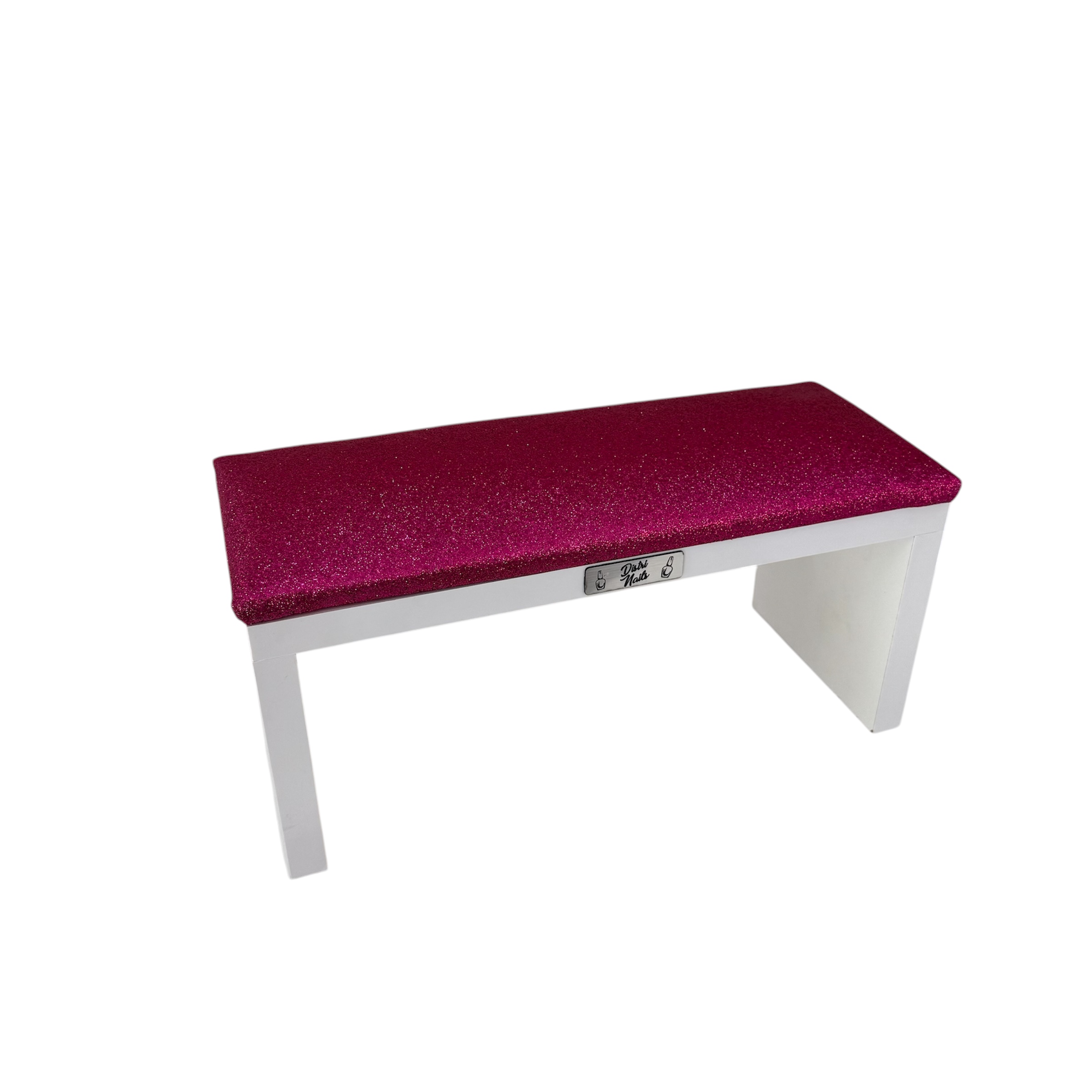 Apoya manos en color de madera blanca con tapizado glitter fucsia.