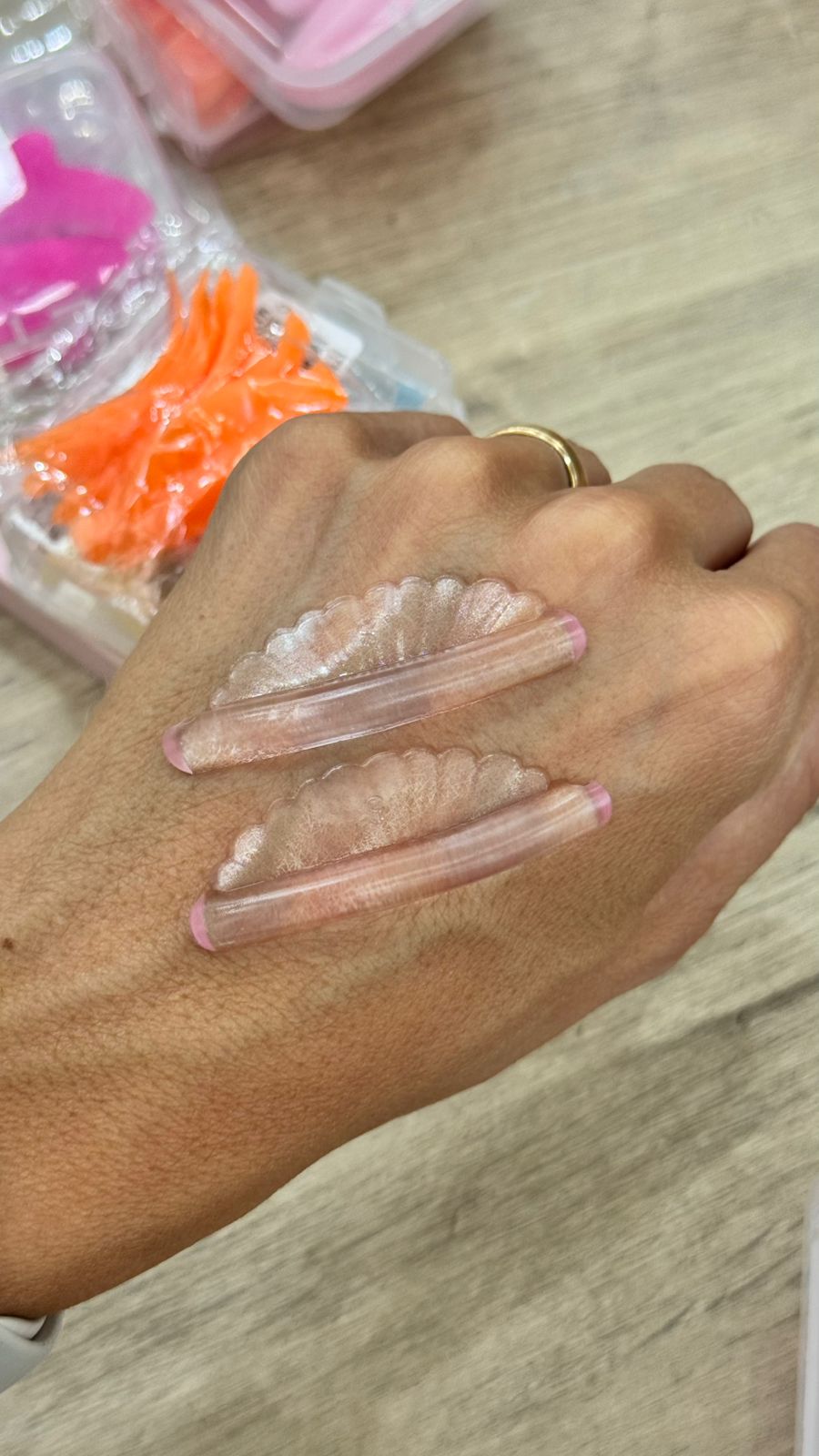 5 pares de bigudies rosa transparentes.