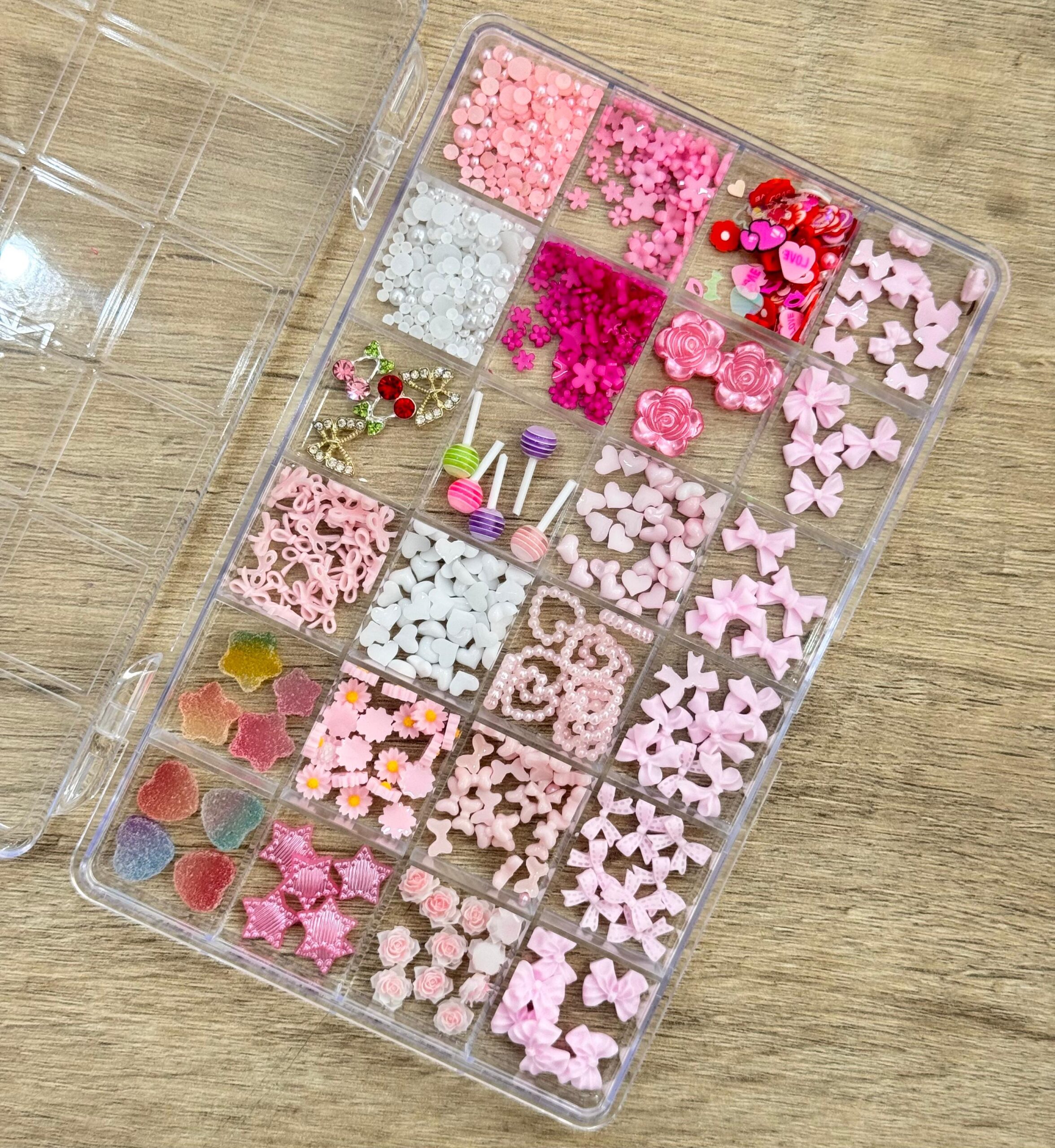 Caja de decoración surtida con strass, caviar y apliques.