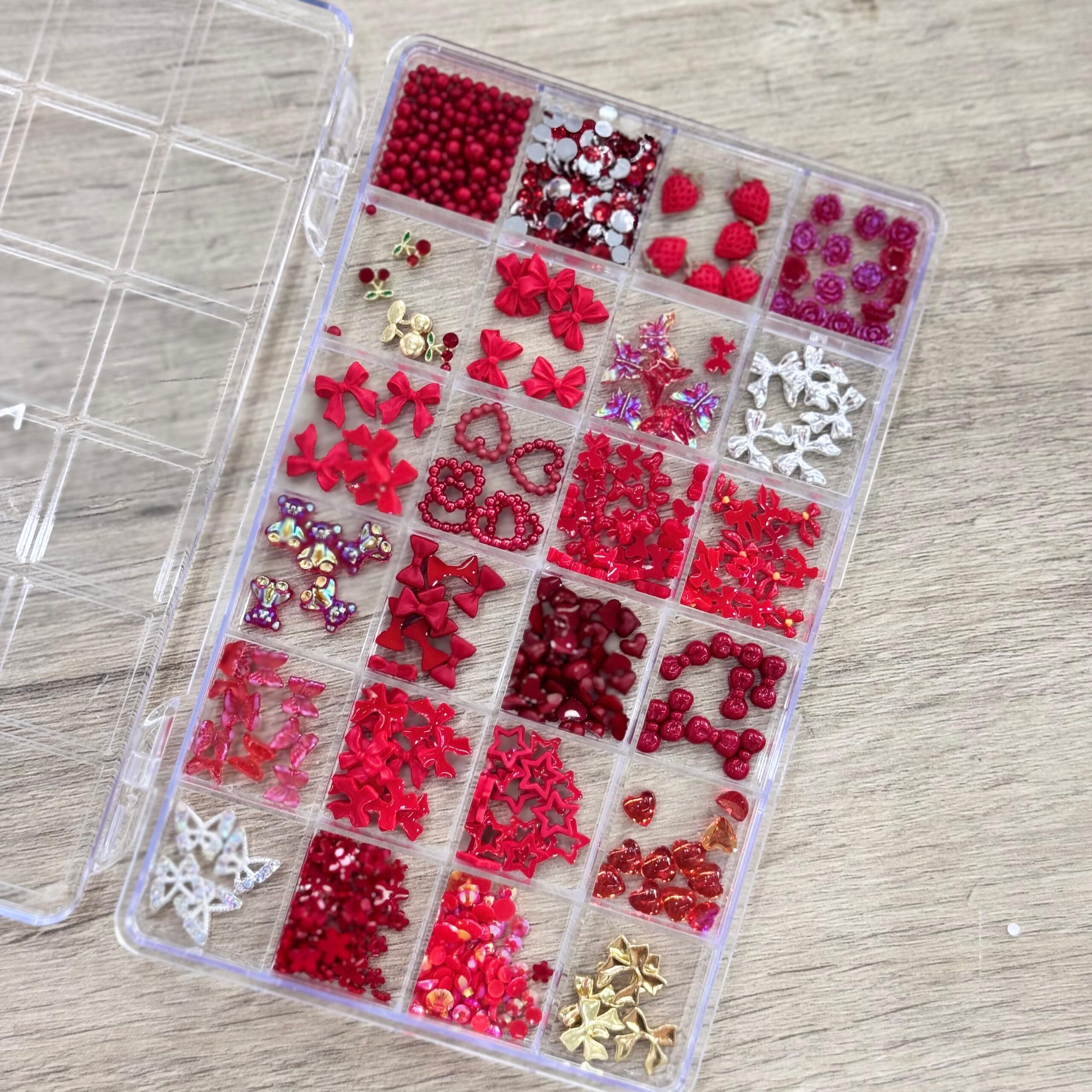 Caja de decoración surtida con strass, caviar y apliques.