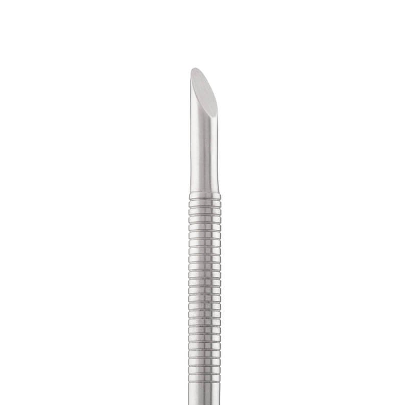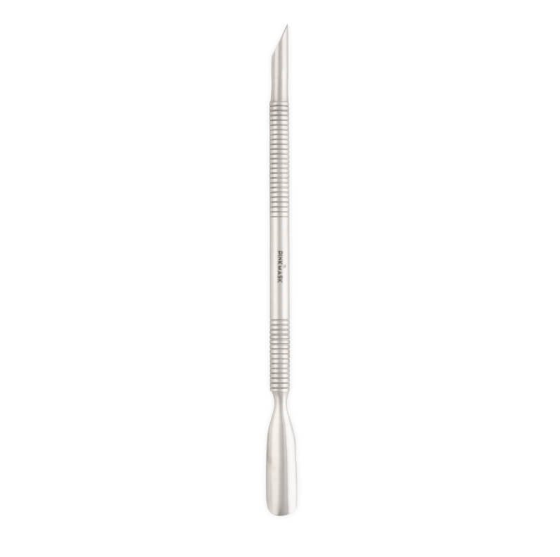 Herramienta esencial para profesionales que buscan precisión y versatilidad. Su diseño de doble función incluye un extremo repujador inclinado para levantar y empujar suavemente cutículas gruesas y fuertemente adheridas, y otro extremo con una punta más redondeada y ancha, ideal para uñas con mayor amplitud.