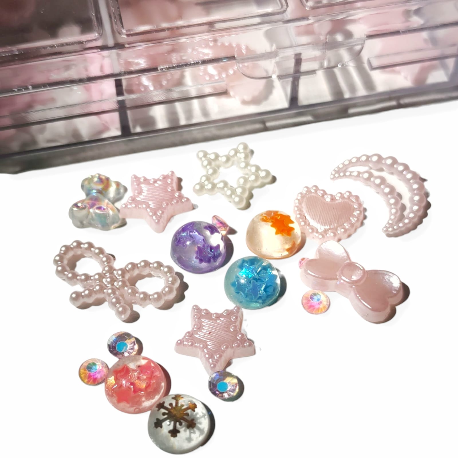 Mix de diseños: corazones, estrellas, medialuna, moños, corazones, strass rosa y ositos.