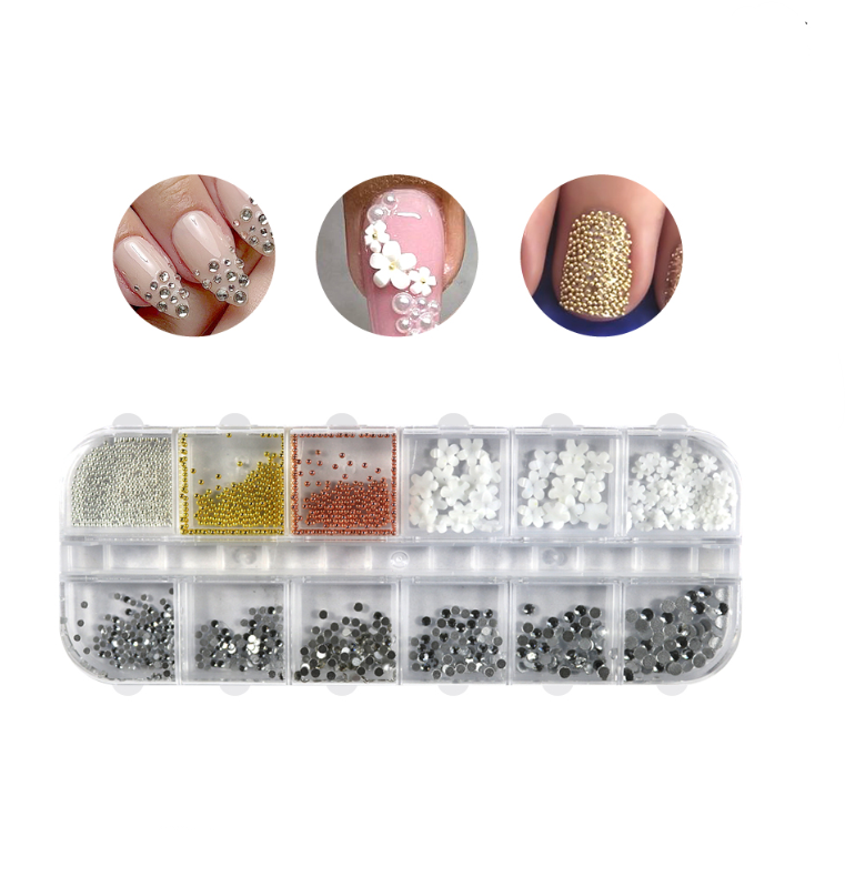 Decoración de uñas en cajita x 12 caviar y florcitas – Cherimoya