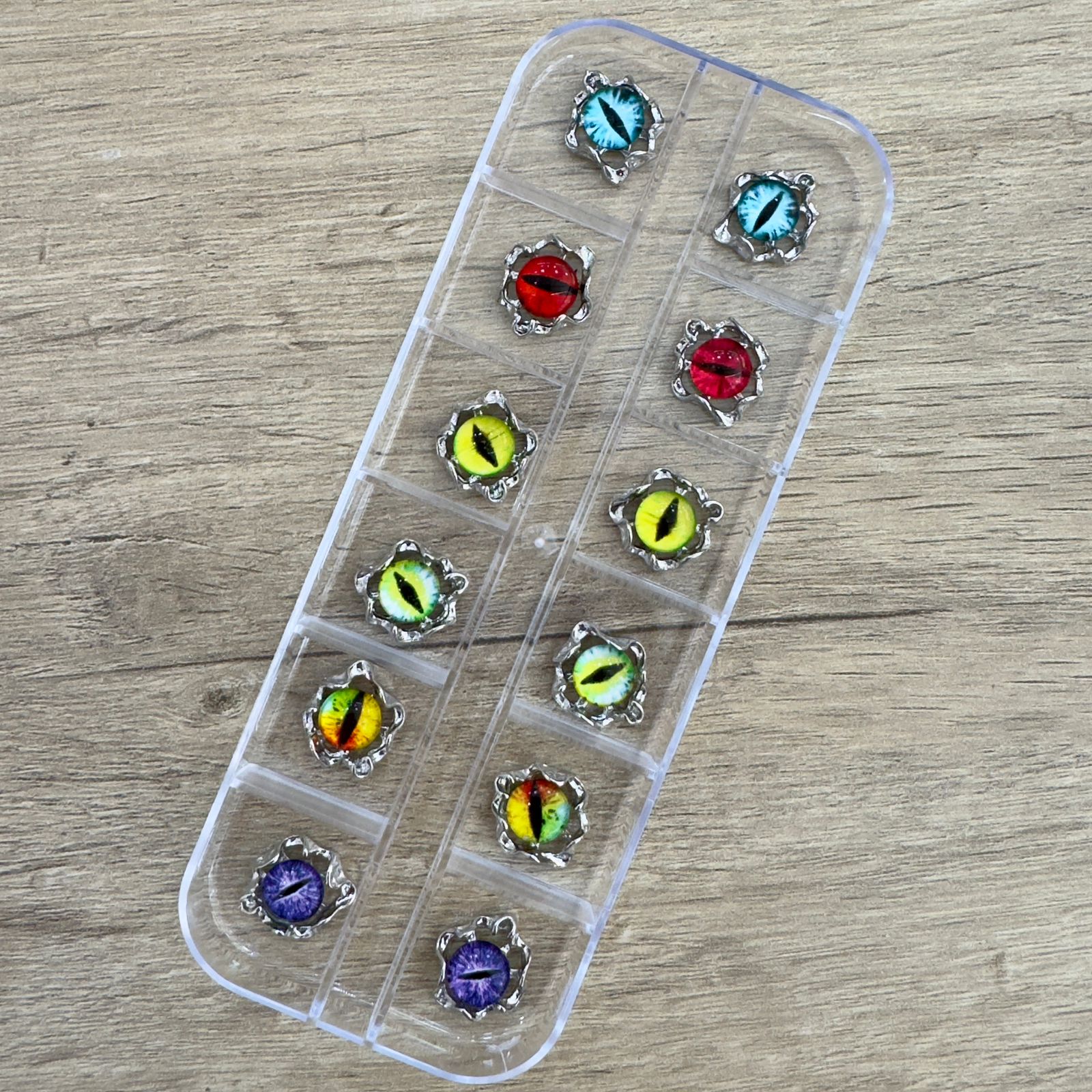 Caja de apliques de 12 colores ojitos, ideales para diseños tendencia como ojo de gato, dragón y halloween.