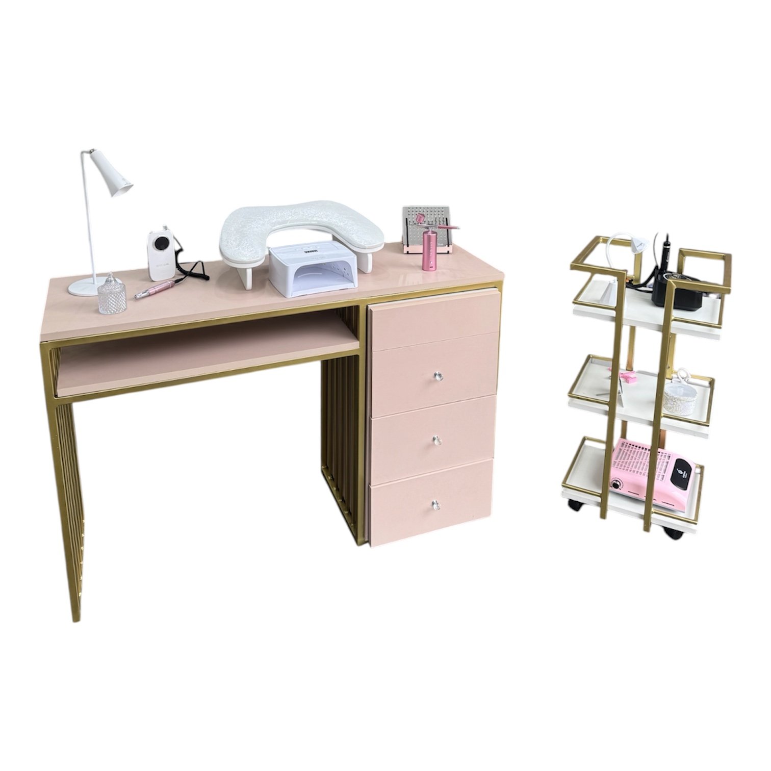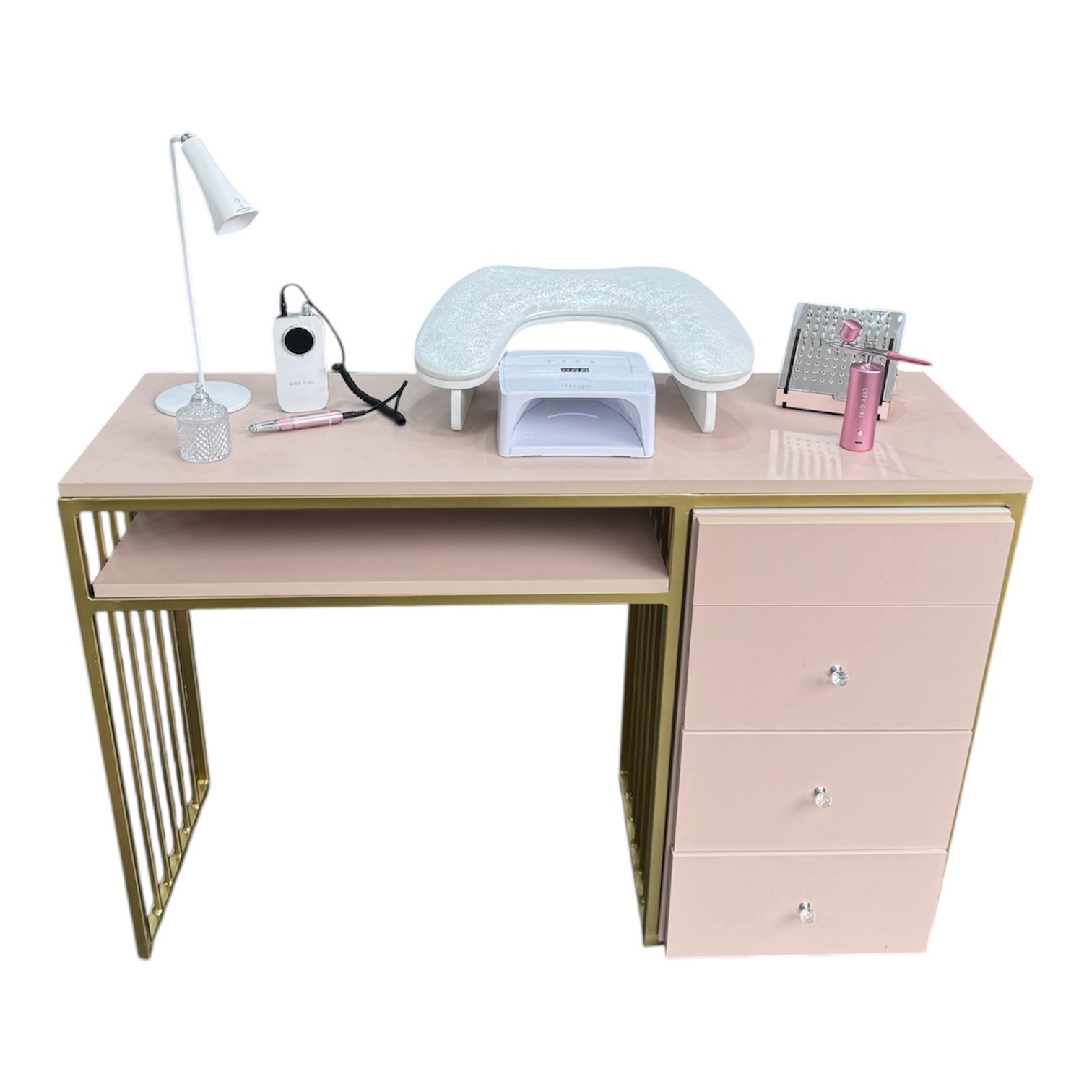 Diseñado para elevar la experiencia en tu espacio de trabajo, este escritorio combina elegancia, funcionalidad y confort en cada detalle. Su estructura metálica en acabado dorado aporta un toque sofisticado, mientras que la superficie en tono rosa blush crea una estética moderna, delicada y altamente atractiva para tu salón.