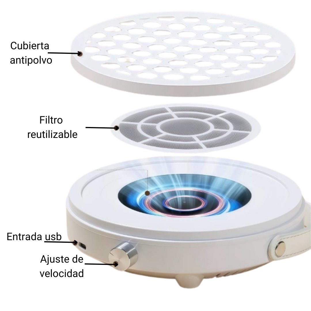 Extractor de polvo de un motor con correa de agarre para transportar, además incluye una cubierta removible con filtro reutilizable, cable usb y ajuste de velocidad.