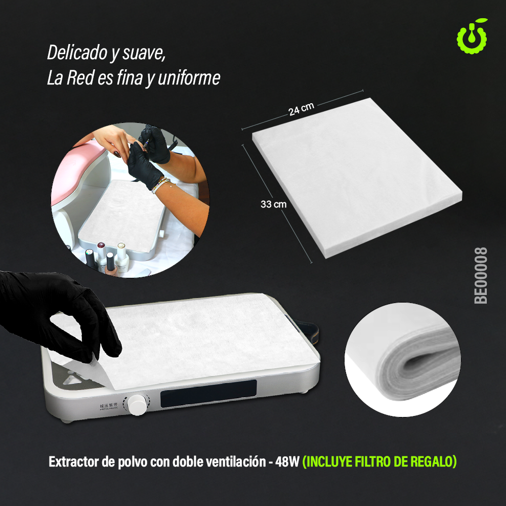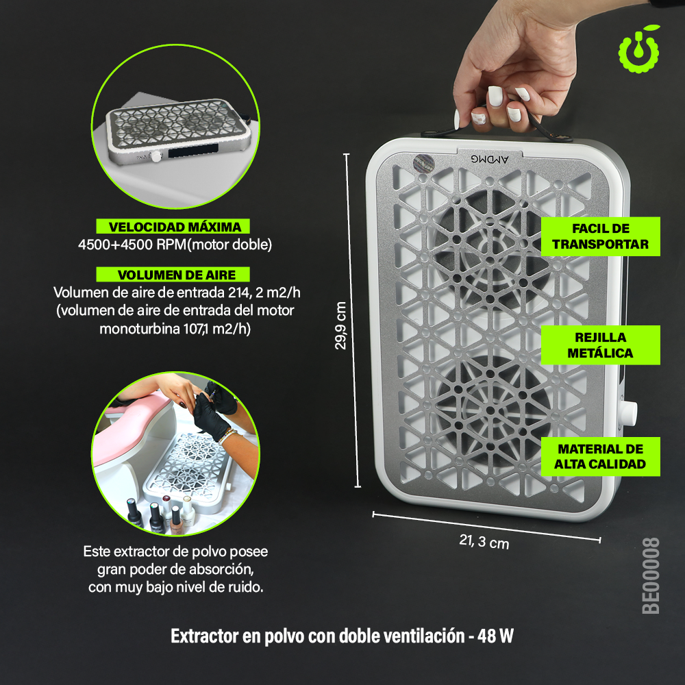 Mantén tu espacio de trabajo limpio y libre de polvo con este potente extractor de polvo para manicura! Diseñado para captar eficazmente las partículas generadas al limar uñas acrílicas, gel o esmalte permanente, este extractor es imprescindible para un ambiente más higiénico y profesional. Su motor de alto renndimiento garantiza una potente succión, su velocidad es regulable y puedes pausar su funcionamiento sin necesidad de apagarlo. Los filtros son desechables y en el interior encontrarás 30 repuestos, cuenta con un doble ventilador turbo y la rejilla superior es metálica e imantada, ideal para salones de belleza o uso personal.