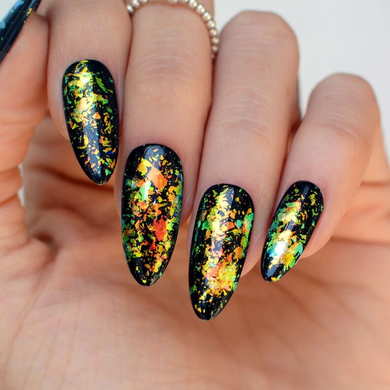 Los Polvos Flakes son el aliado perfecto para crear diseños únicos y sorprendentes. Su textura ultrafina y reflectante los hace ideales para agregar un toque de brillo y dimensión a cualquier técnica de nail art. Podés aplicarlos sobre la capa de inhibición de cualquier Gel Color o encapsularlos para un acabado más sofisticado.