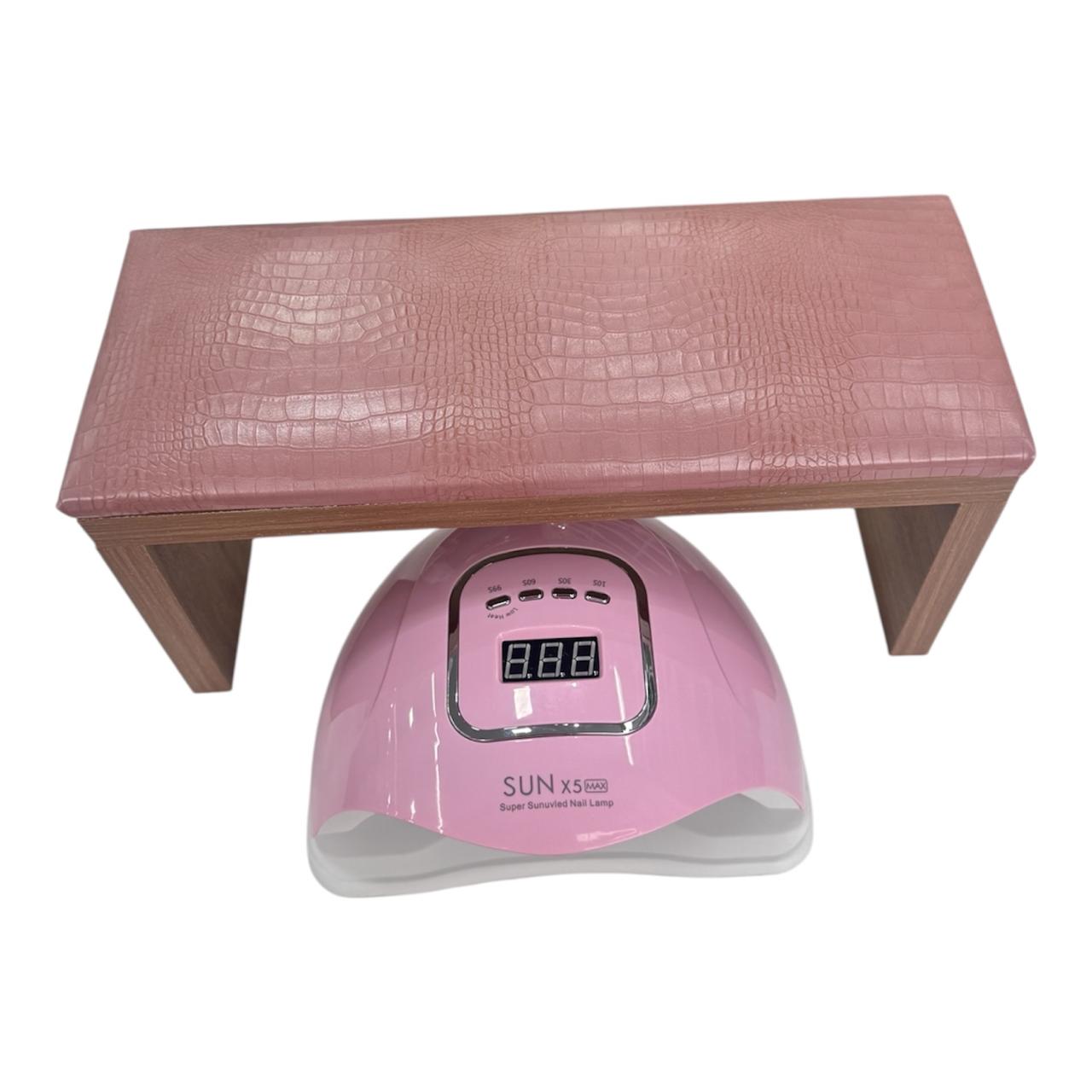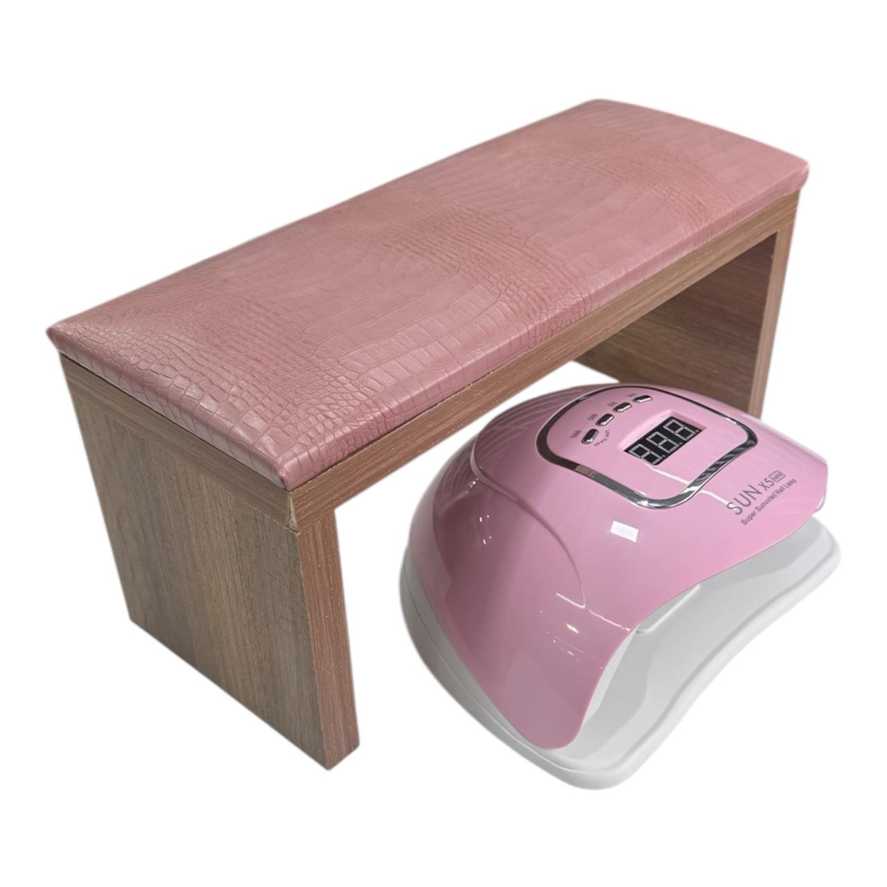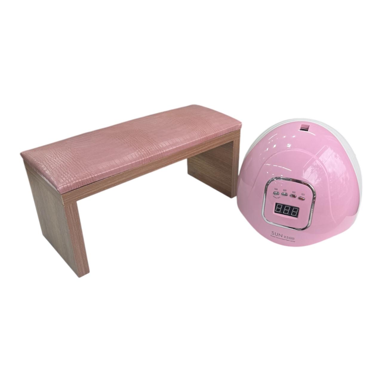 Kit cabina sun rosada de 120w + apoya manos banquito premium con almohadilla texturada rosa con diseño tipo cocodrilo.