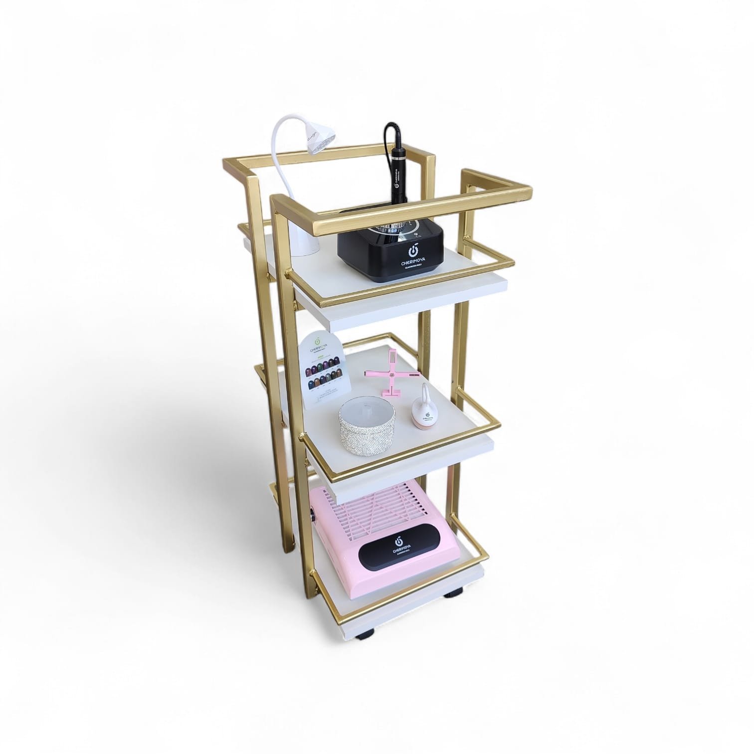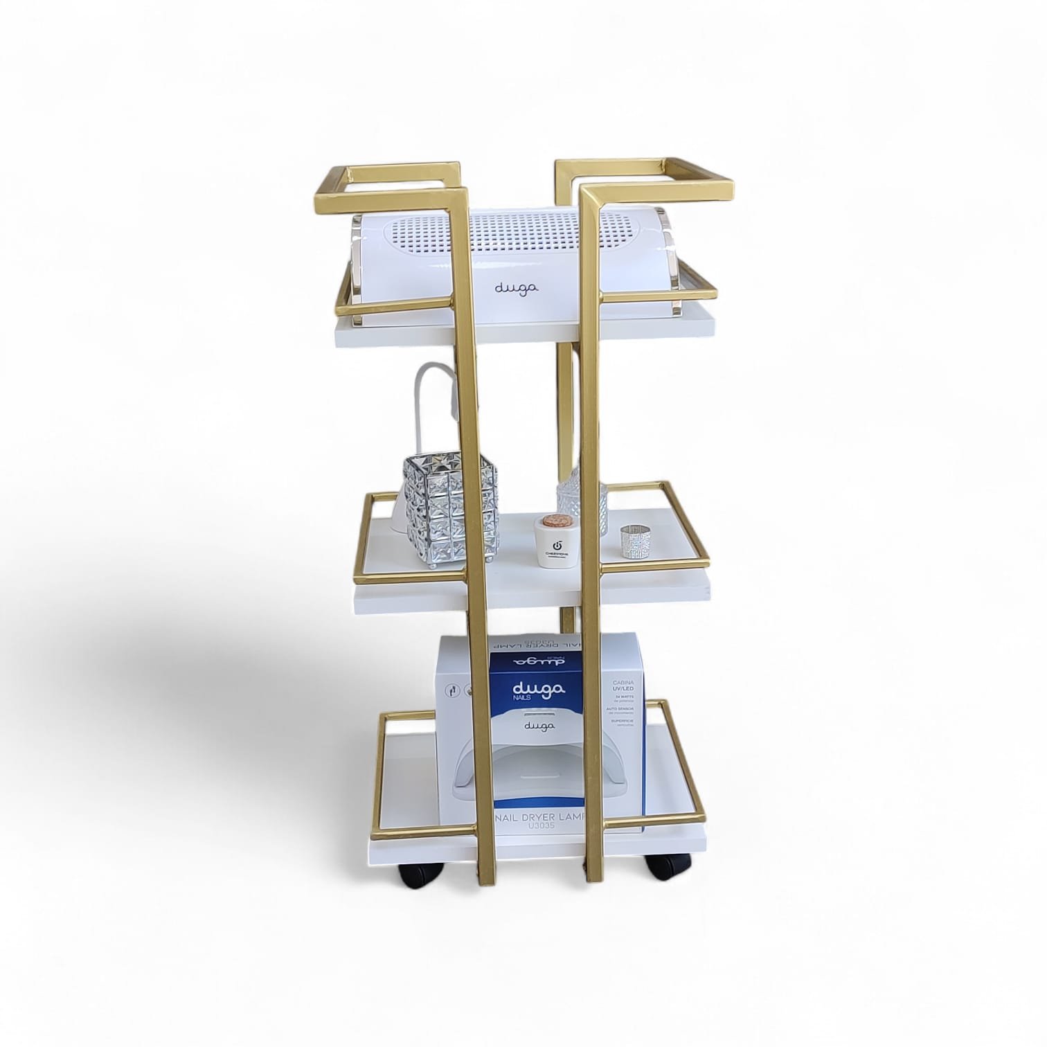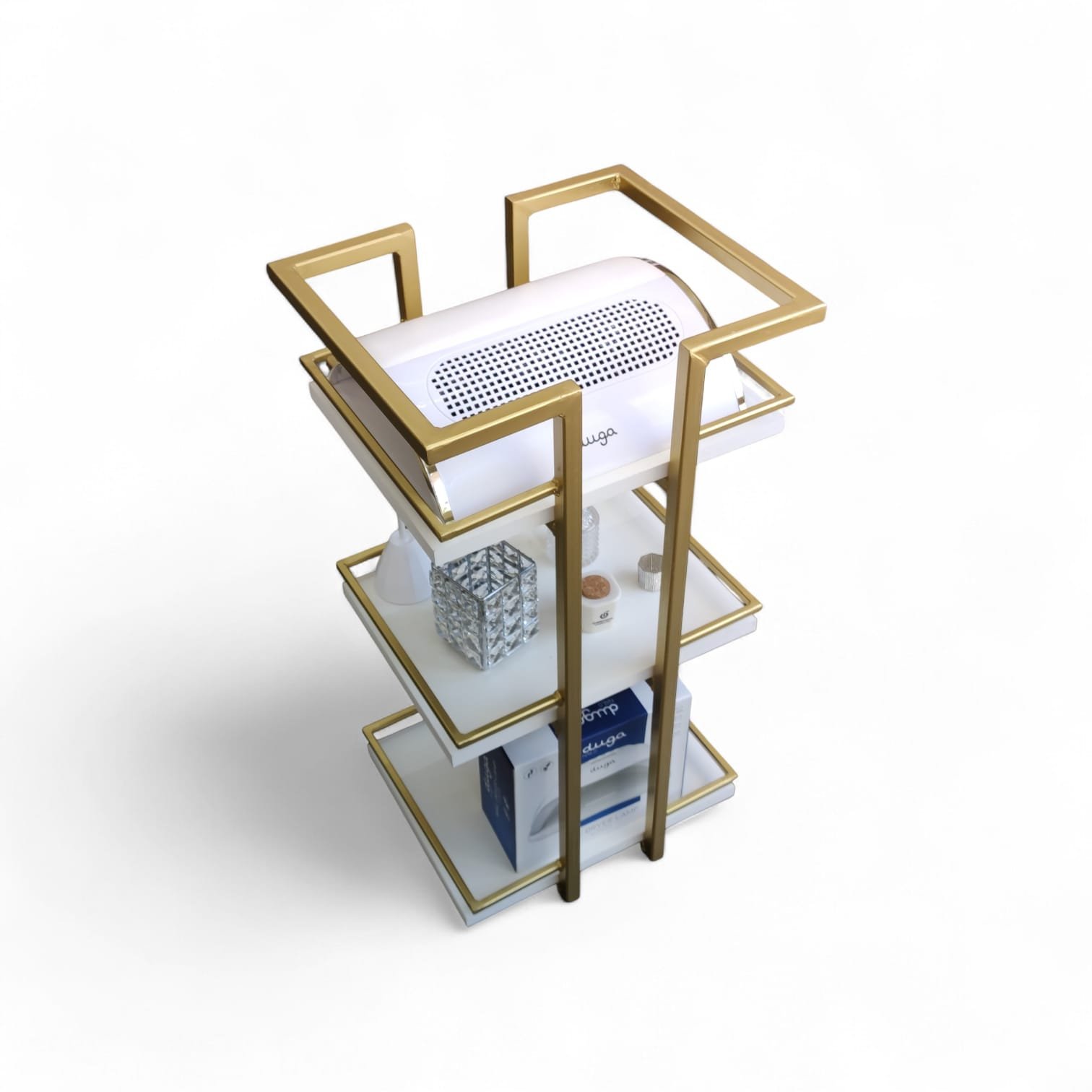 Mesa auxiliar con estantes de madera combinados con hierro.